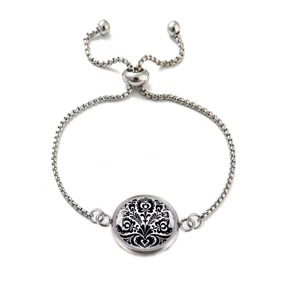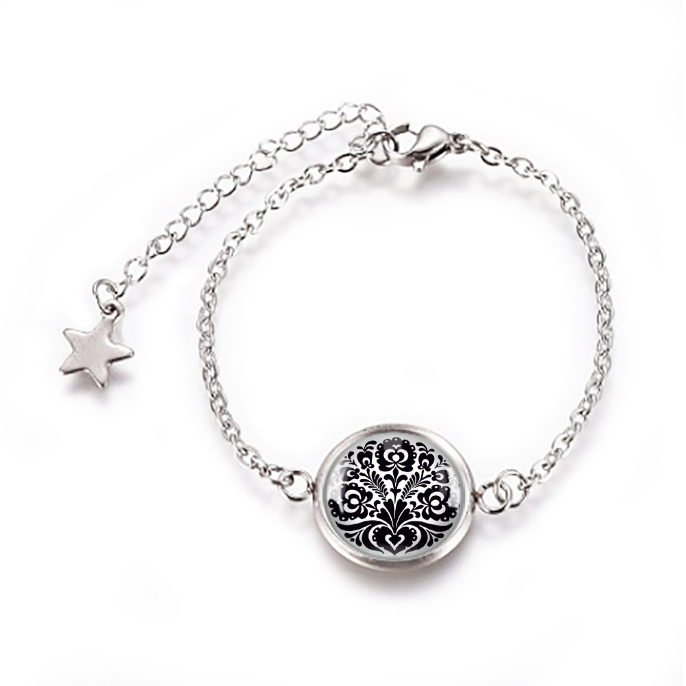 Magyar népművészeti motívumkincs felhasználásával készült nemesacél, orvosi fém karkötő, 12 mm átmérőjű üveglencsével, csúszózáras vagy kapcsos kivitelben.