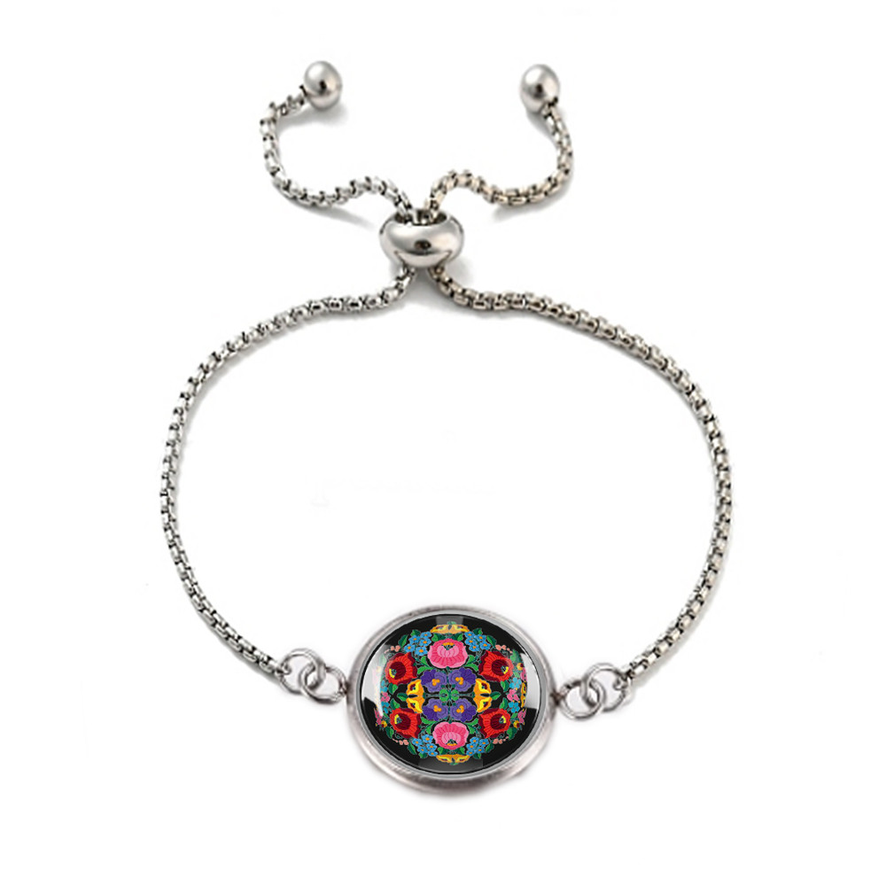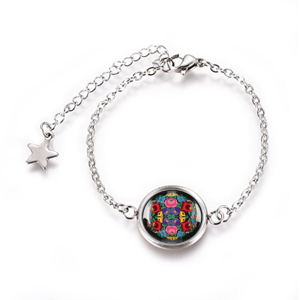 Magyar népművészeti motívumkincs felhasználásával készült nemesacél, orvosi fém karkötő, 12 mm átmérőjű üveglencsével, csúszózáras vagy kapcsos kivitelben.