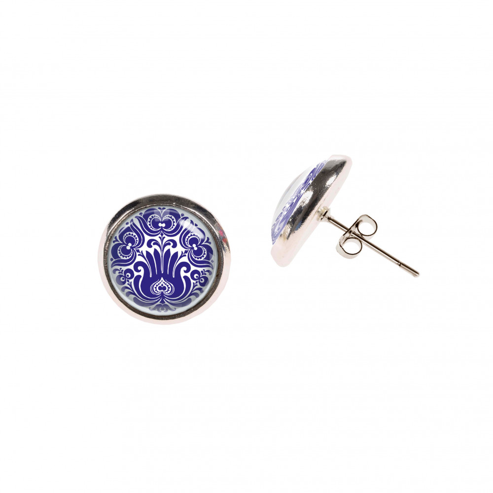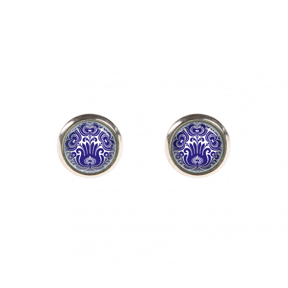 Magyar népművészeti motívumkincs felhasználásával készült, ezüstözött betűzős fülbevaló 8 vagy 10 mm átmérőjű üveglencsével.