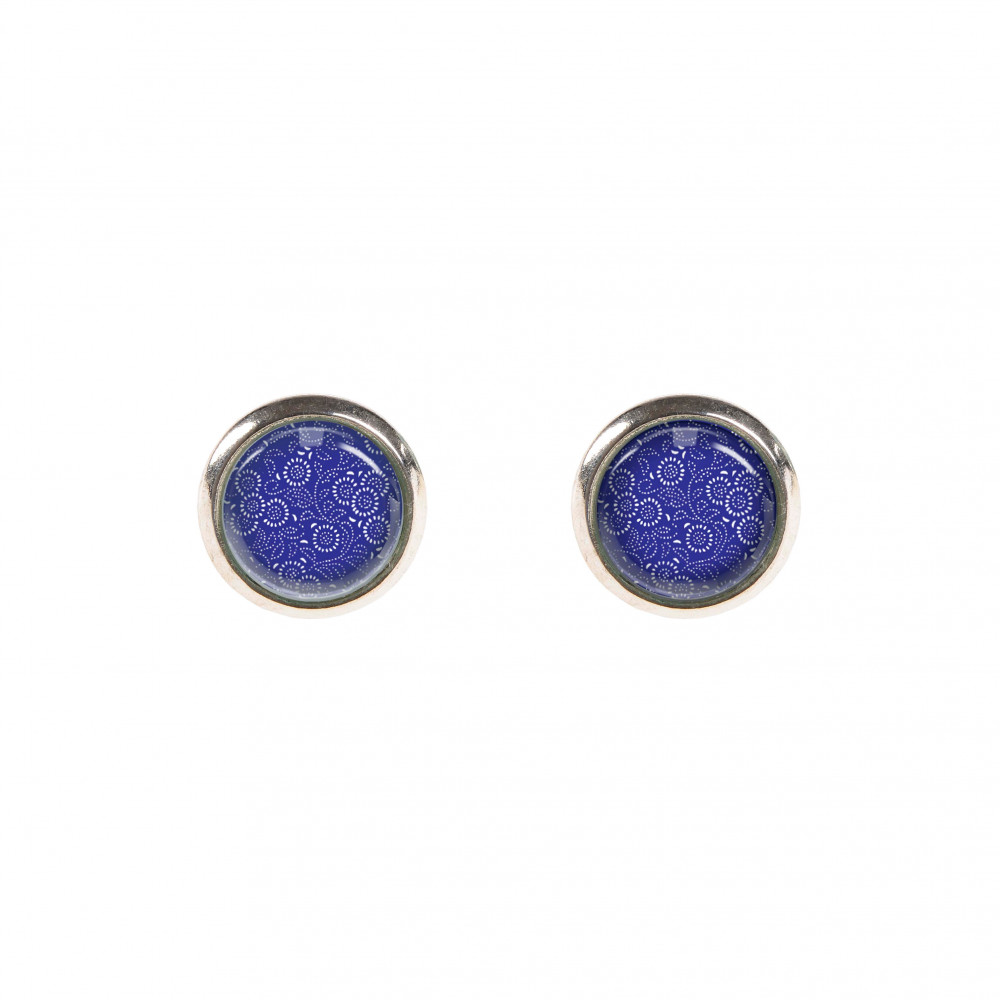 Magyar népművészeti motívumkincs felhasználásával készült, ezüstözött betűzős fülbevaló 8 vagy 10 mm átmérőjű üveglencsével.