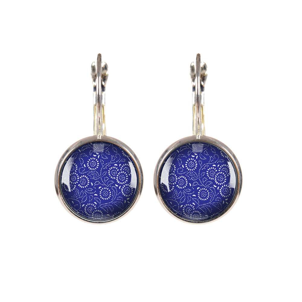 Magyar népművészeti motívumkincs felhasználásával készült, ezüstözött kapcsos fülbevaló 10 vagy 14 mm átmérőjű üveglencsével.