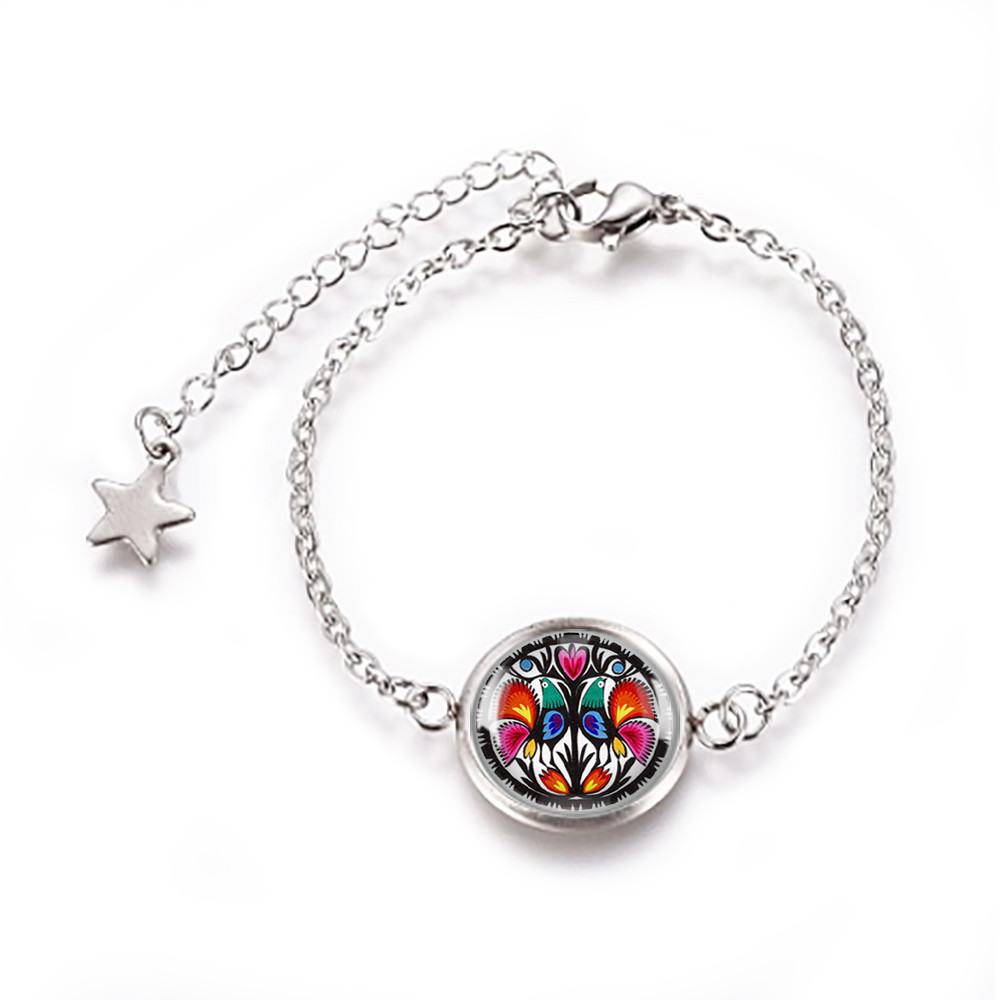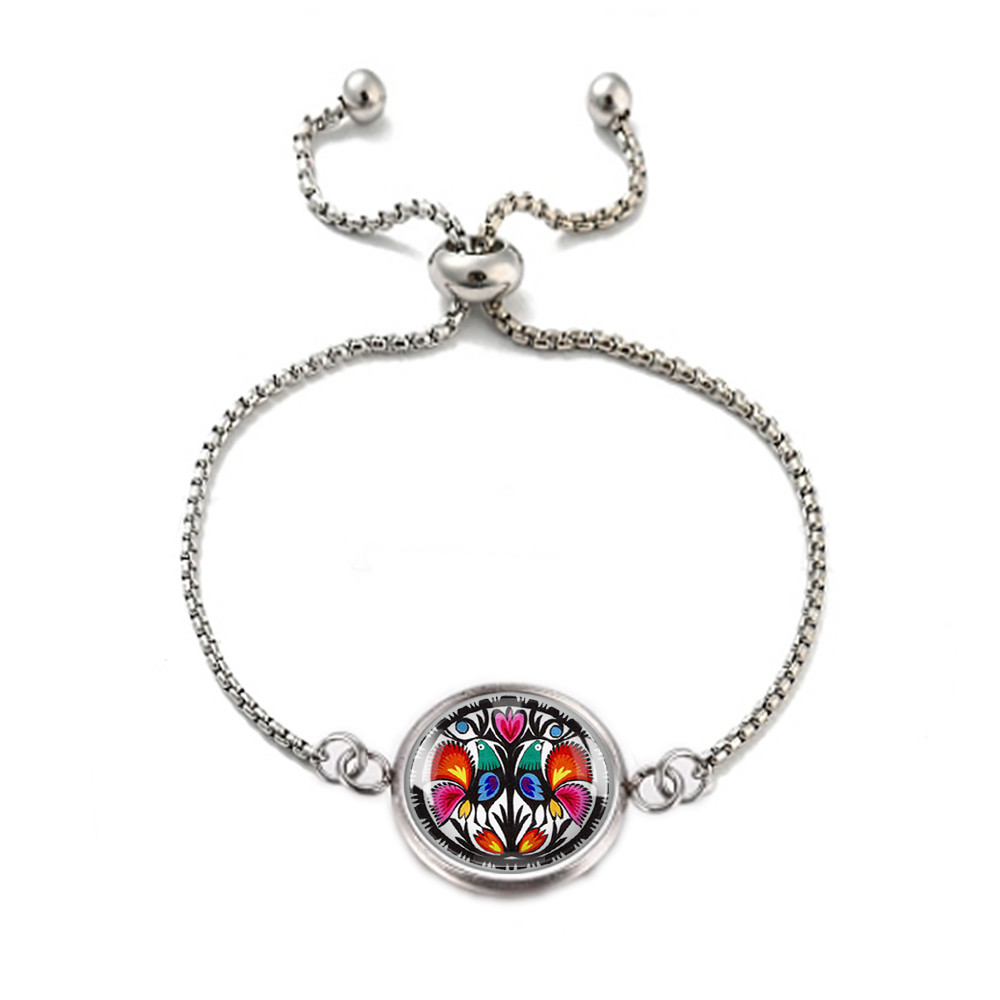 Lengyel népművészeti motívumkincs felhasználásával készült nemesacél, orvosi fém karkötő, 12 mm átmérőjű üveglencsével, csúszózáras vagy kapcsos kivitelben.