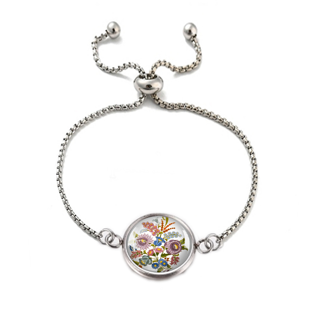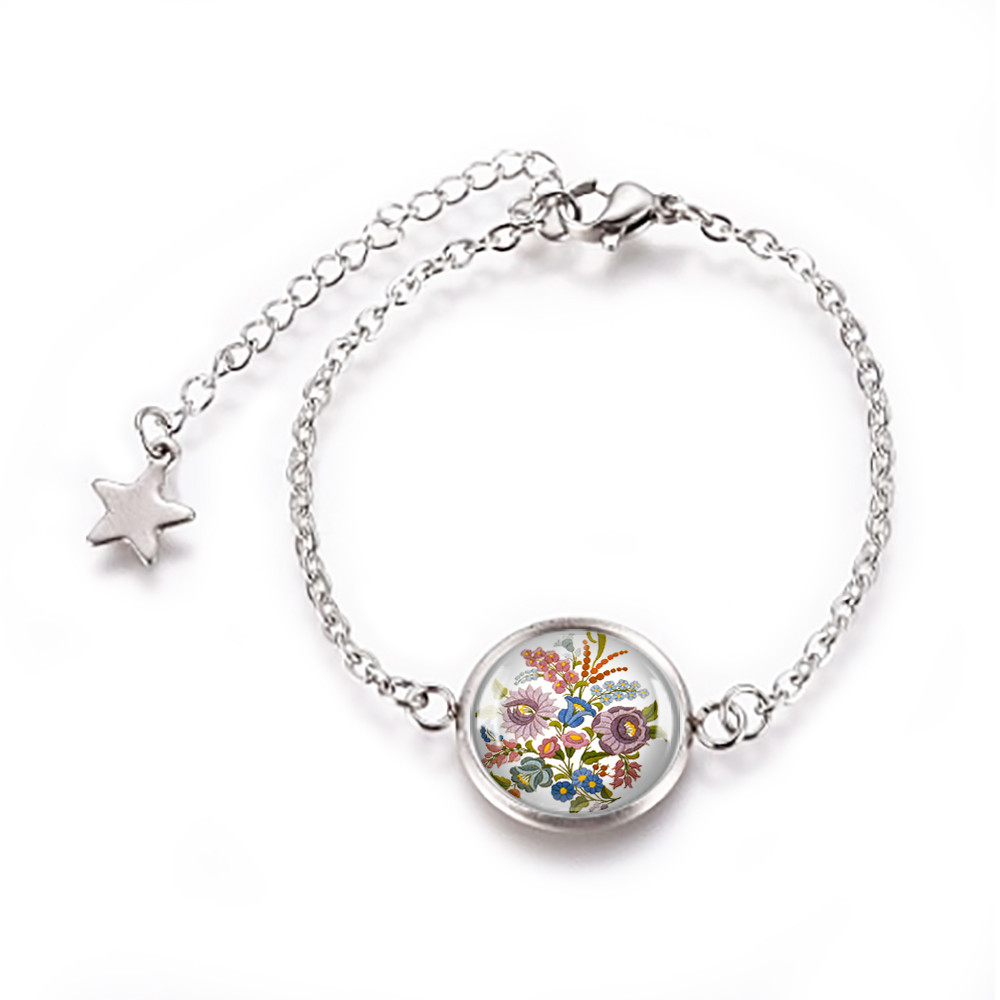 Magyar népművészeti motívumkincs felhasználásával készült nemesacél, orvosi fém karkötő, 12 mm átmérőjű üveglencsével, csúszózáras vagy kapcsos kivitelben.
