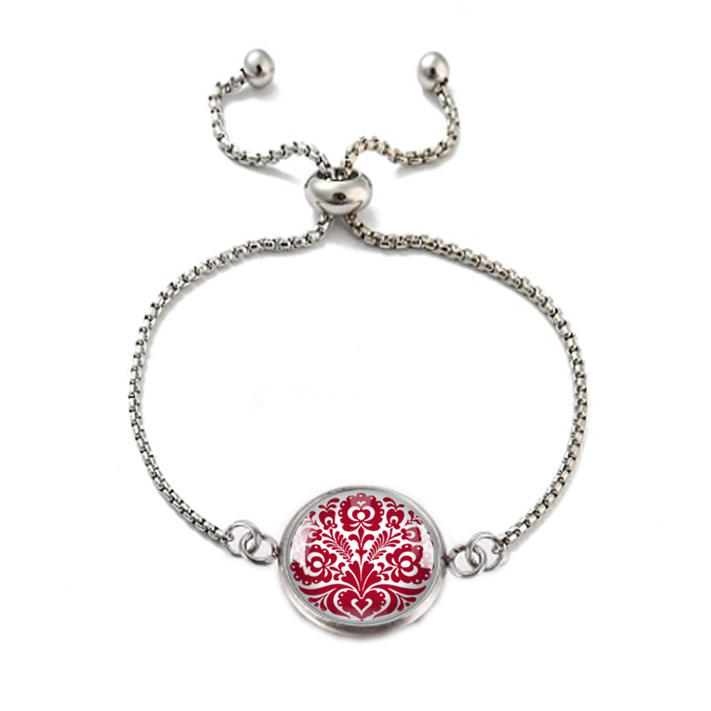 Magyar népművészeti motívumkincs felhasználásával készült nemesacél, orvosi fém karkötő, 12 mm átmérőjű üveglencsével, csúszózáras vagy kapcsos kivitelben.