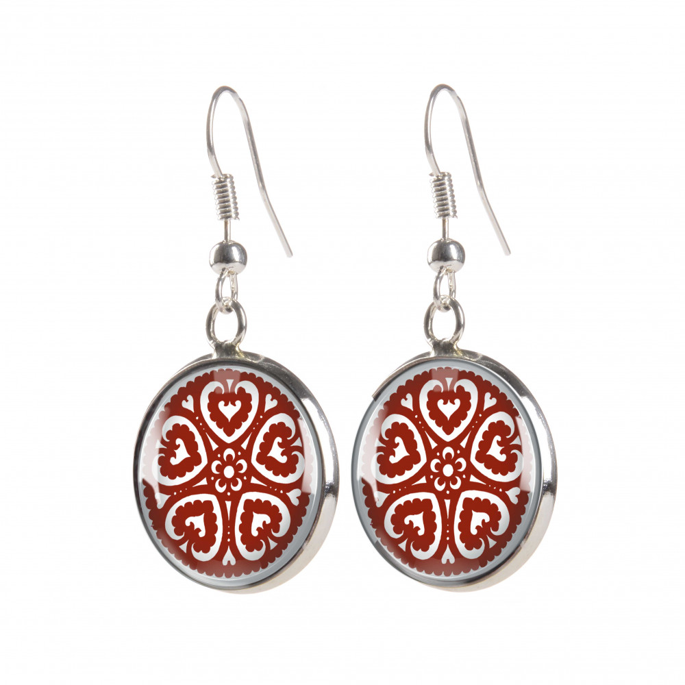 Magyar népművészeti motívumkincs felhasználásával készült, ezüstözött akasztós fülbevaló 14 vagy 18 mm átmérőjű üveglencsével.