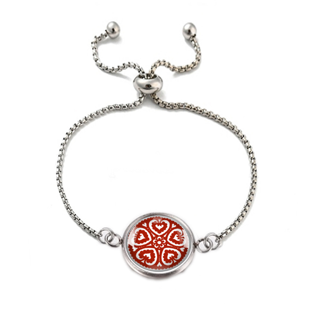 Magyar népművészeti motívumkincs felhasználásával készült nemesacél, orvosi fém karkötő, 12 mm átmérőjű üveglencsével, csúszózáras vagy kapcsos kivitelben.