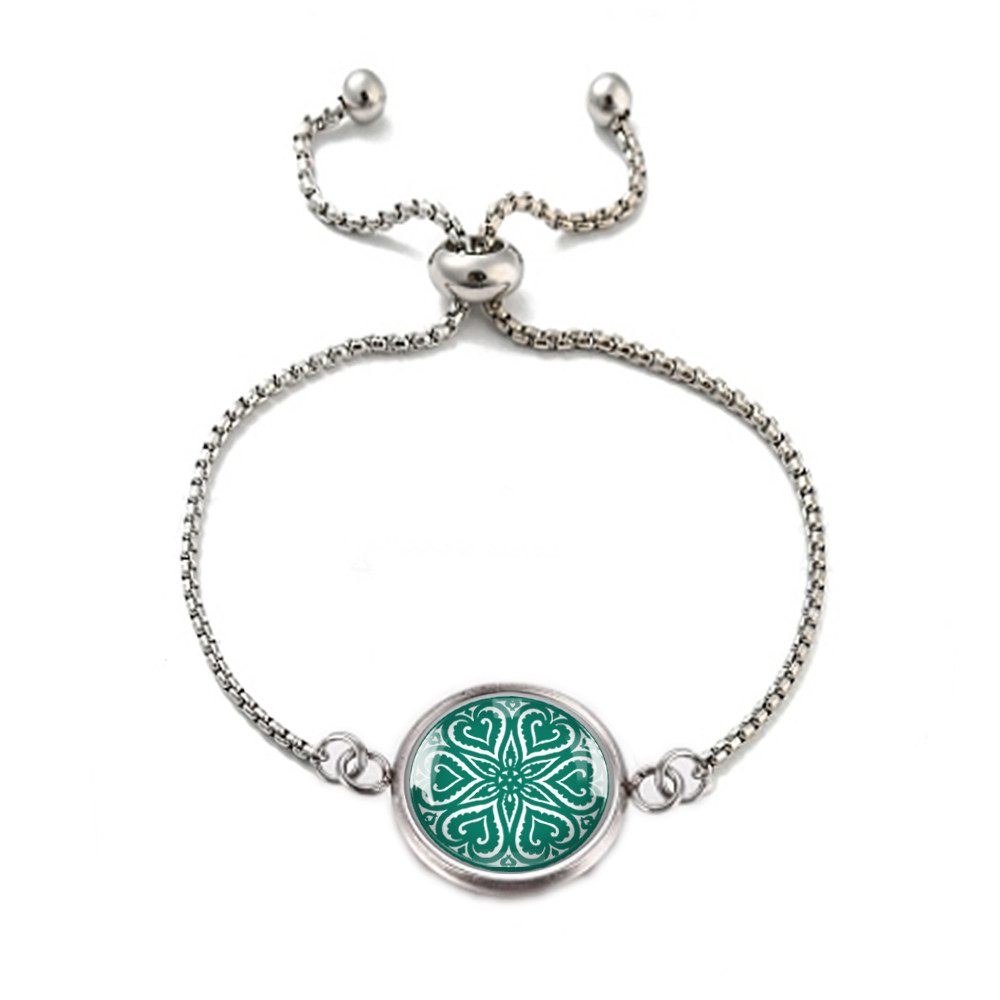 Magyar népművészeti motívumkincs felhasználásával készült nemesacél, orvosi fém karkötő, 12 mm átmérőjű üveglencsével, csúszózáras vagy kapcsos kivitelben.