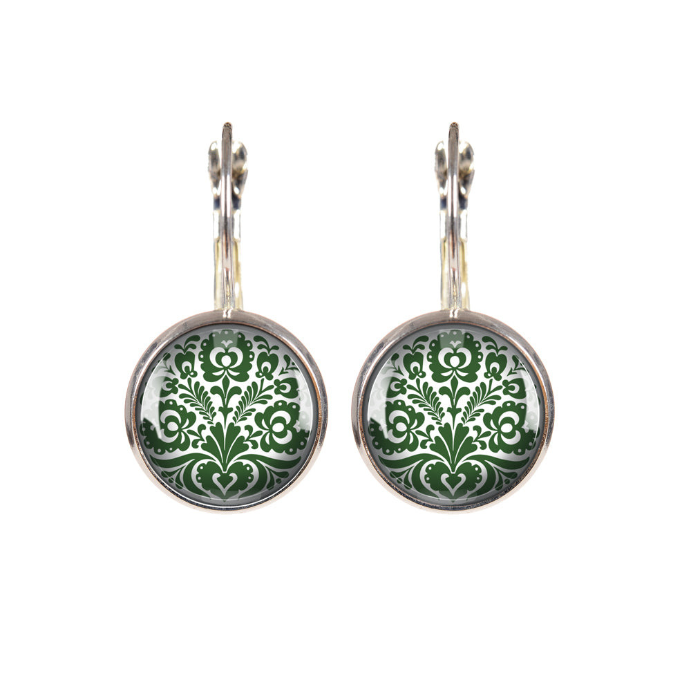 Magyar népművészeti motívumkincs felhasználásával készült, ezüstözött kapcsos fülbevaló 10 vagy 14 mm átmérőjű üveglencsével.