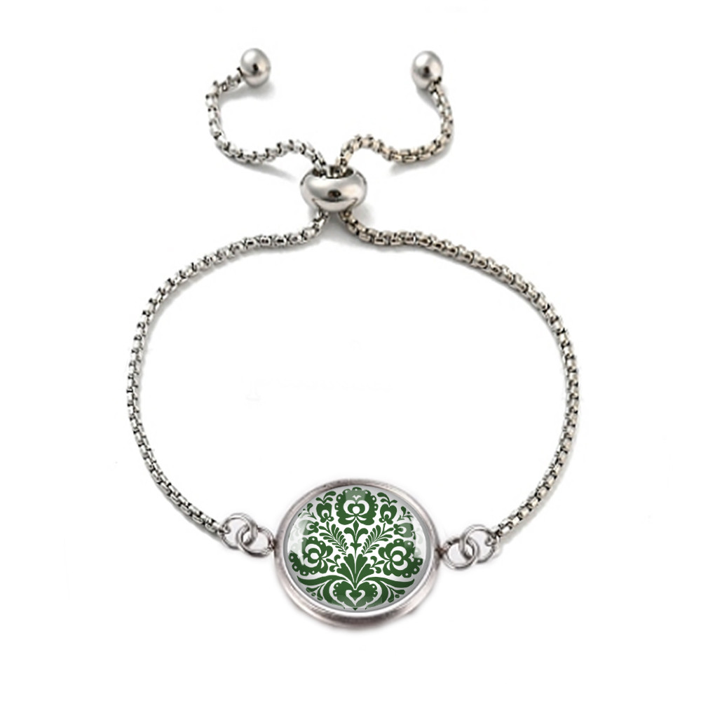 Magyar népművészeti motívumkincs felhasználásával készült nemesacél, orvosi fém karkötő, 12 mm átmérőjű üveglencsével, csúszózáras vagy kapcsos kivitelben.